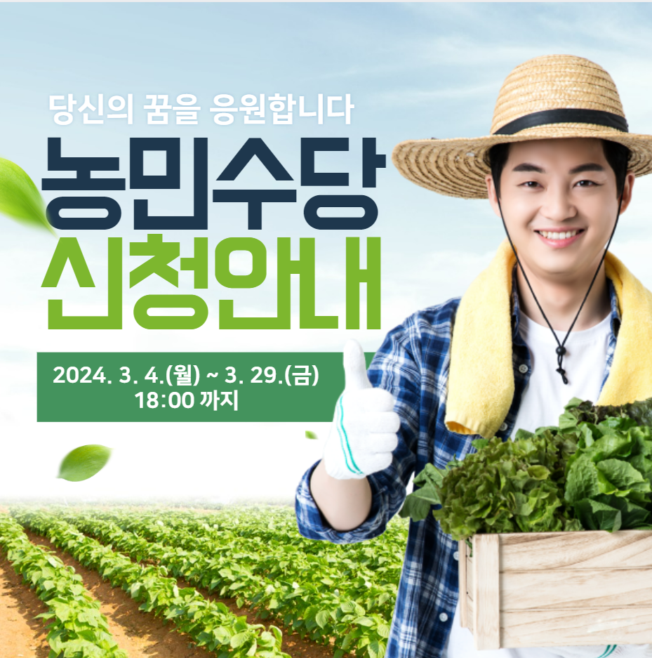 농업과 농총의 공익적 가치에 대한 보장 및 지역경제 활성화를 위해 농민수당을 신청 받고 있으니, 해당 전업 농업인들은 신청 바랍니다.
