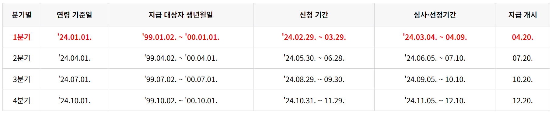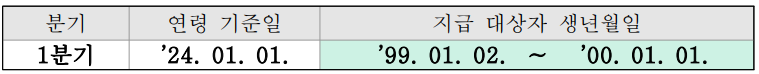 ○ 2024년 01월 1일 기준 24세 청년에 한해서, 지난 분기 미신청분 추가신청 가능