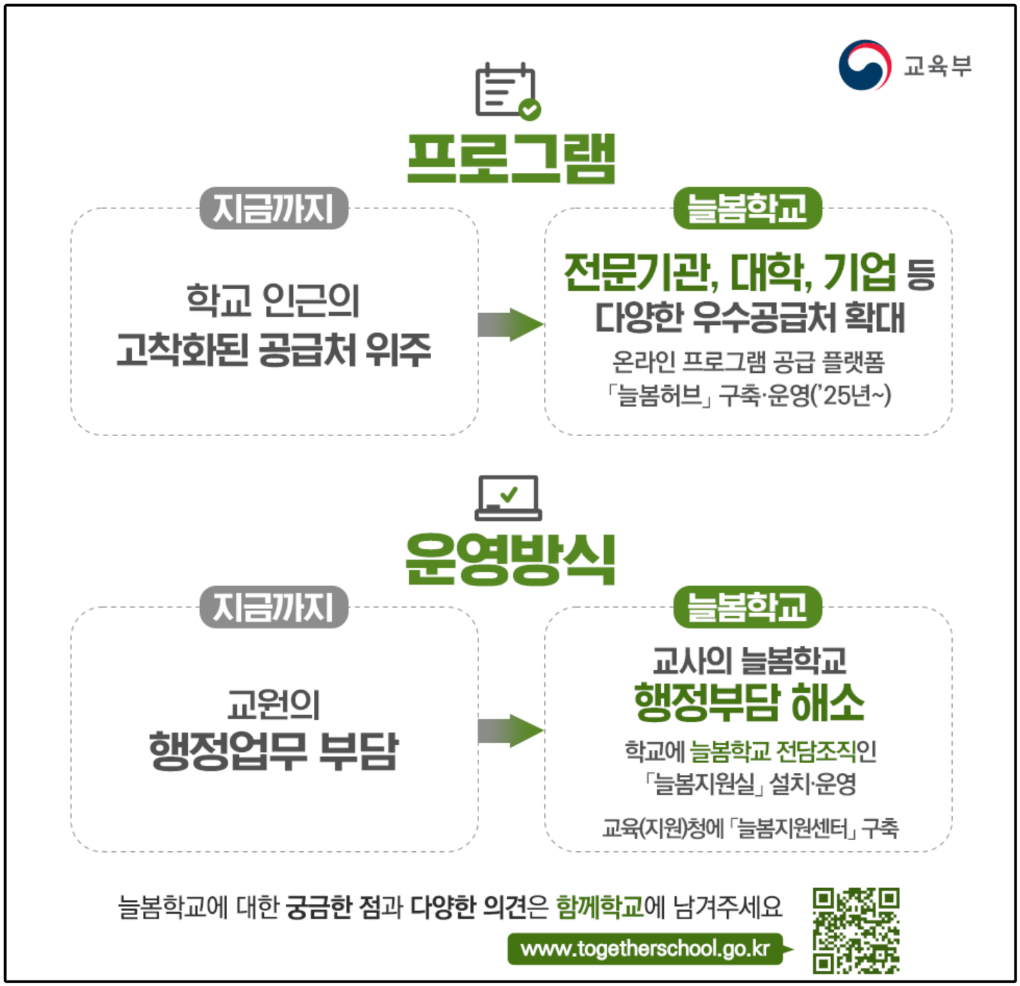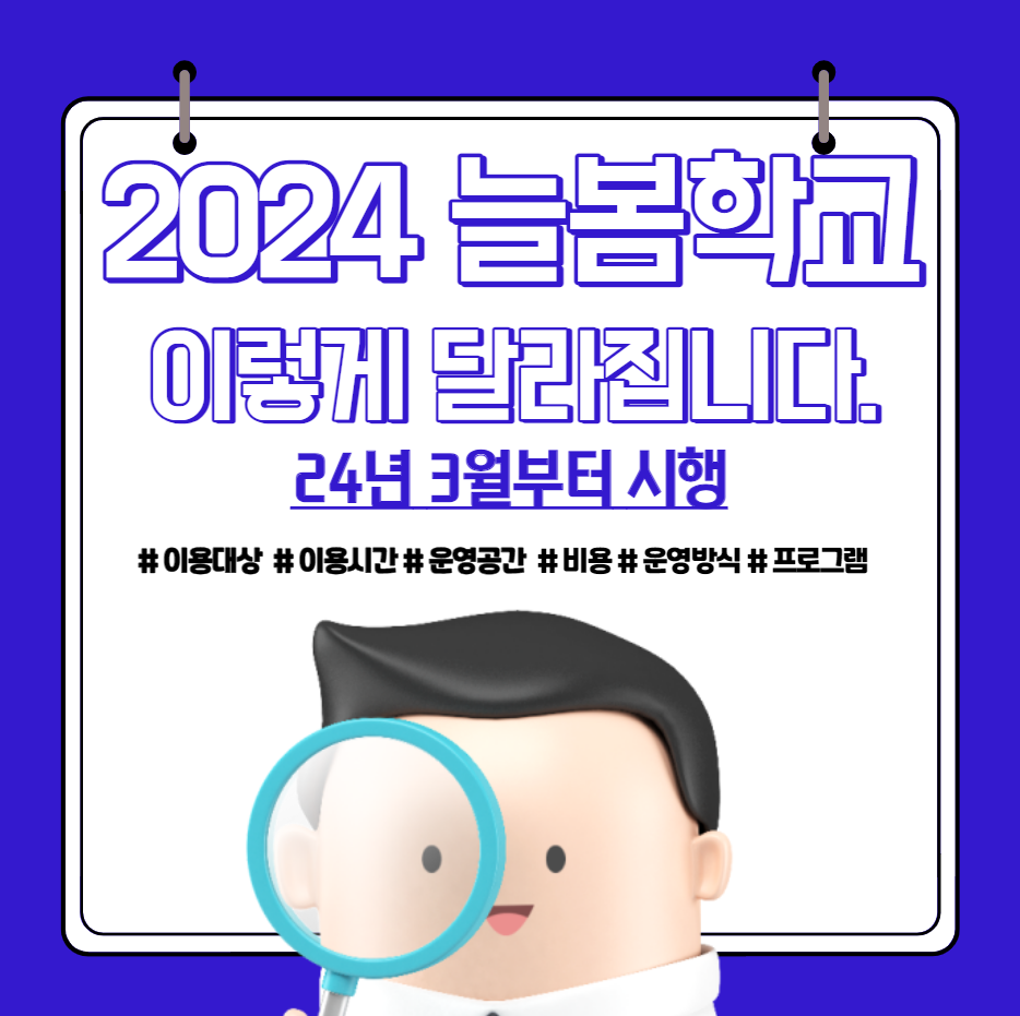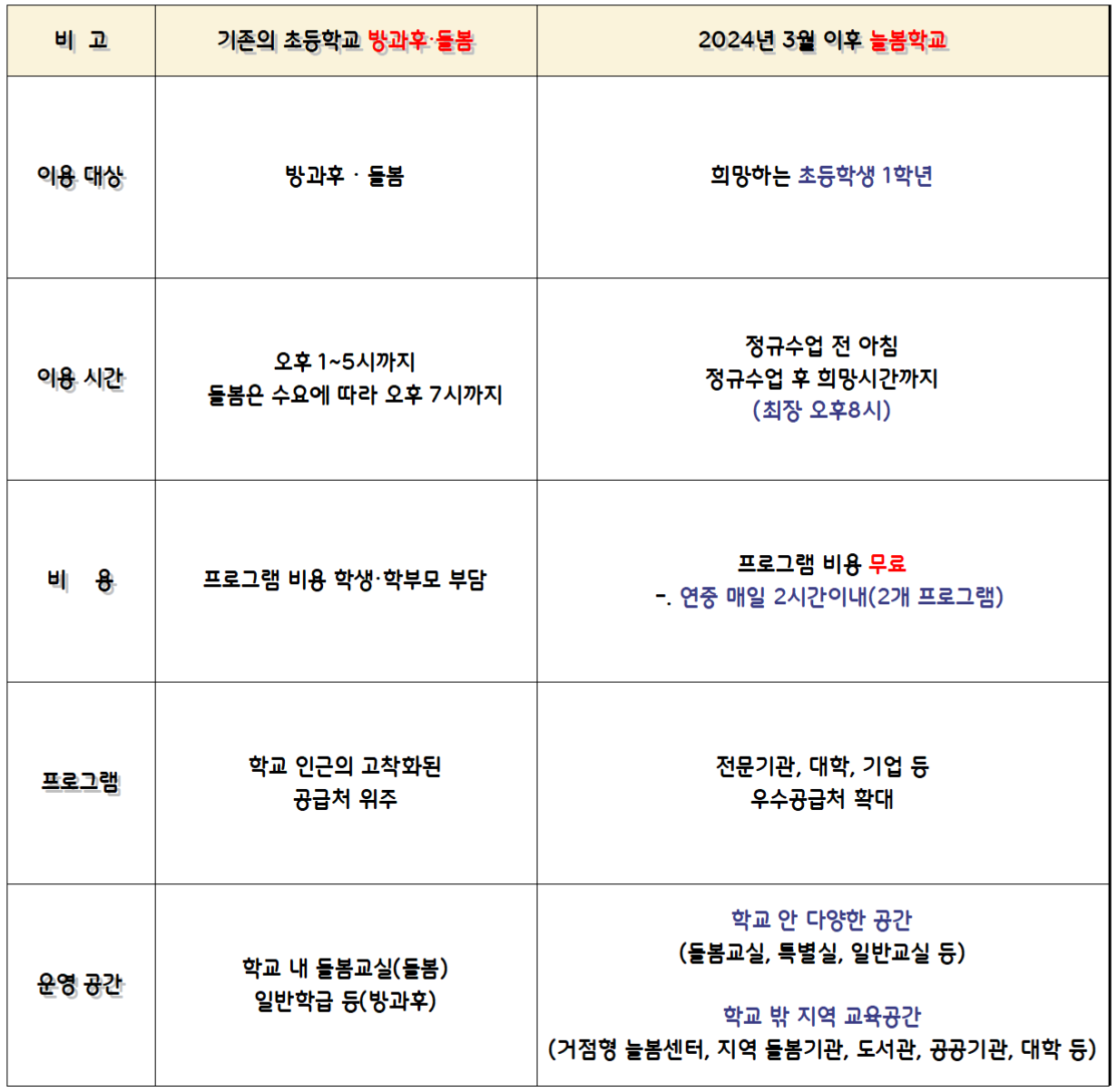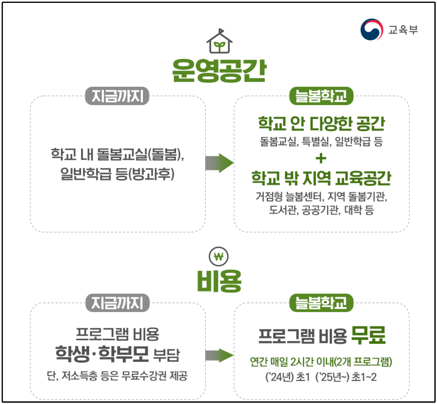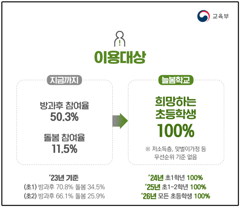 2024년부터 희망하는 초등학생에게 기존의 방과후와 돌봄을 통합한 종합 교육프로그램인 늘봄학교를 전국에 본격 도입합니다.