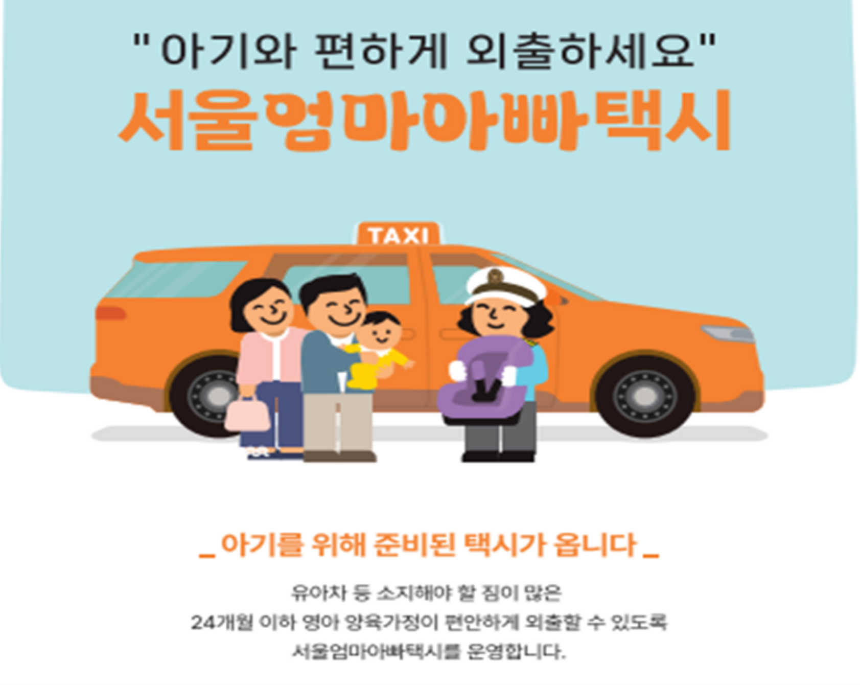 대형 승합차에 KC 인증된 카시트는 물론, 살균 기능이 있는 공기청정기와 손소독제, 비말차단 스크린까지 설치된 안전하고 쾌적한 환경에서 아이와 함께 이동할 수 있는 서비스이다. 서울시가 영아 한 명당 10만 원의 택시 이용권을 지원해 예방접종이나 진료를 위해 병 · 의원을 찾거나 약국에 갈 때 등 외출을 돕고, 양육자의 교통비 부담도 덜어주는 가성비 높은 정책이다. 영아 1인당 연 10만원 택시(카시트 구비) 이용 포인트 지급