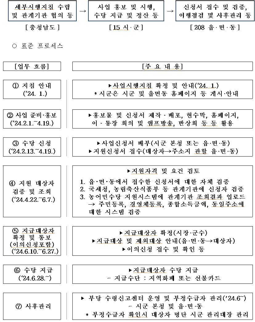 수당 신청 전년도(2023년) 1월 1일 이전부터 수당지급일까지 계속하여 충청남도 내 주민등록(실제거주)이 되어 있고, 농어업 경영체를 등록(실제 농어업에 종사), 유지하고 있는자